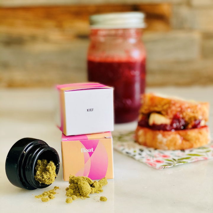Kief is a very quick and easy way to cook with cannabis. Kief is the trichomes, or resign glands, that develop on the flower buds & sugar leaves of cannabis. You’ll hear me refer to it on buds as the “frosty goodness”. The trichomes are what contain all of the cannabinoids, terpenes & flavonoids that make each cannabis strain potent, unique & effective. When processing buds & plant material, some of the trichomes are knocked off, collected & packaged for your enjoyment. (You no longer have to wait for the bottom chamber of your grinder to fill up.) There are many ways to enjoy kief. The most popular is to smoke or vaporize it by adding it on top of a bowl, or mixed into a joint, to enhance the effects of flower. You can also use it to make edibles, which you know I did. I used the Tillamook Strawberry kief from Surterra to make an infused strawberry jam. Perfect for an elevated PB&J!